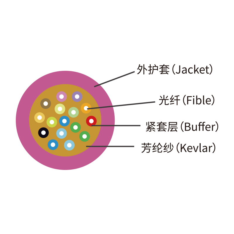 結(jié)構(gòu):緊套光纖由光纖涂覆層表面緊套一層或多層被覆層構(gòu)成,便于剝離使用,內(nèi)置多股芳綸加強(qiáng)構(gòu)件、具有良好的機(jī)械保護(hù)性能和抗拉力